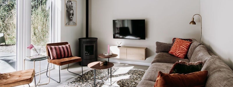 Op de begane grond is de heerlijke lichte woonkamer met openslaande deuren naar de tuin. Het beste deel van de woonkamer is toch wel de grote plofbank met uitzicht op het bos en het haardje. Je kunt hier royaal met zijn vieren of vijven op zitten (of liggen). Er staan ook nog twee verplaatsbare stoelen. De eettafel is groot genoeg om een avond lang te borrelen, tafelen of spelletjes te doen. Of alledrie natuurlijk.