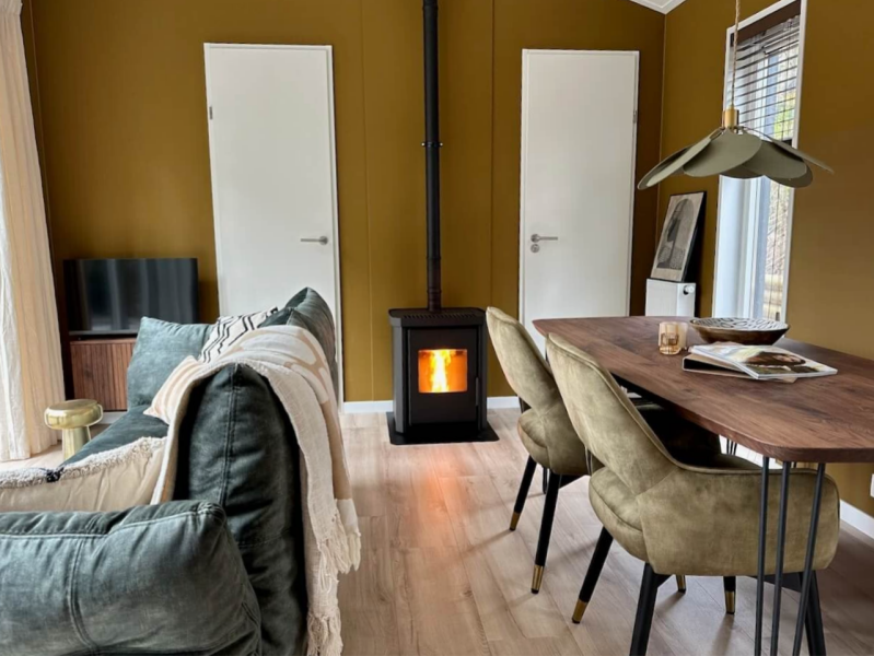 De heerlijke plofbank staat op de beste plek: met uitzicht op het bos en voor de openslaande deuren. Hier kun je lekker naar de bomen staren, een boek lezen, of toch even tv kijken. De pelletkachel geeft die gezellige sfeer en een behaaglijke warmte. Aan de tafel eet je met gemak met 5 personen. Je kunt er trouwens ook goed aan werken, spelletjes spelen of uitgebreid borrelen. Doordat het licht van twee kanten komt en je aan alle kanten uitzicht hebt op groen, is dit onze favoriete plek.